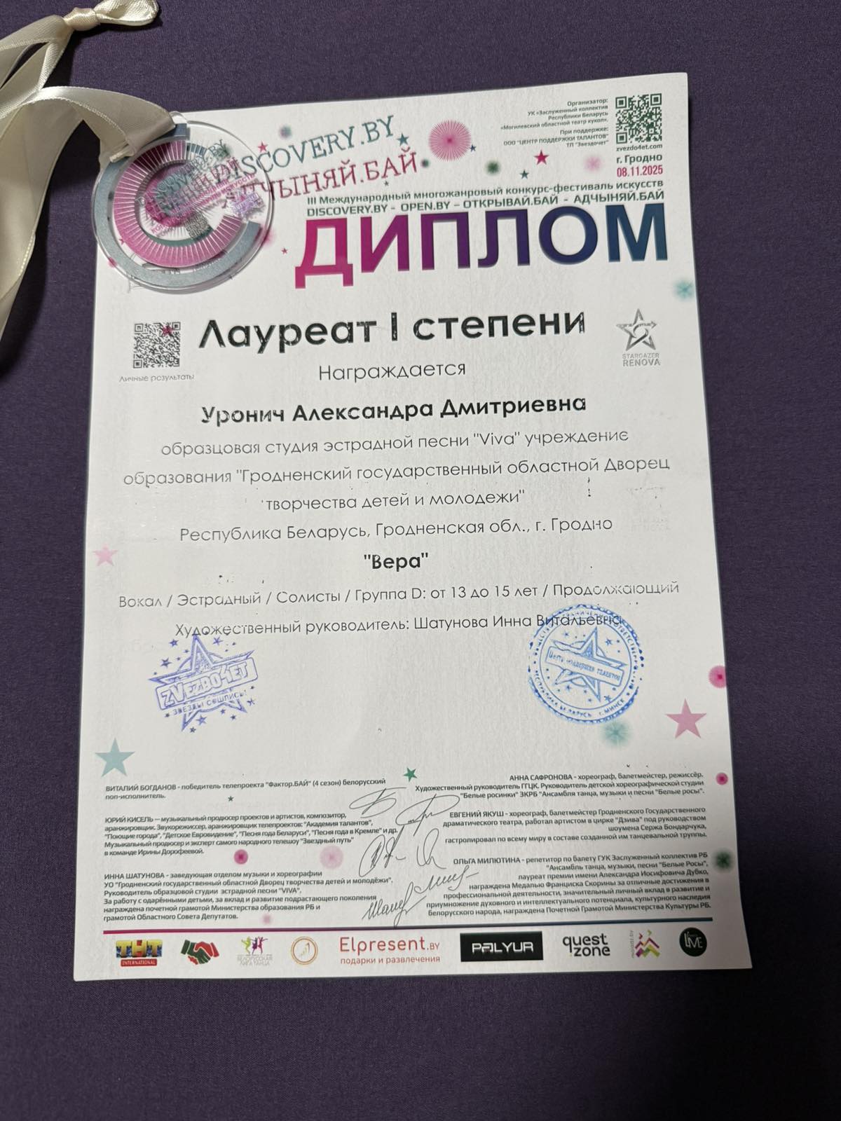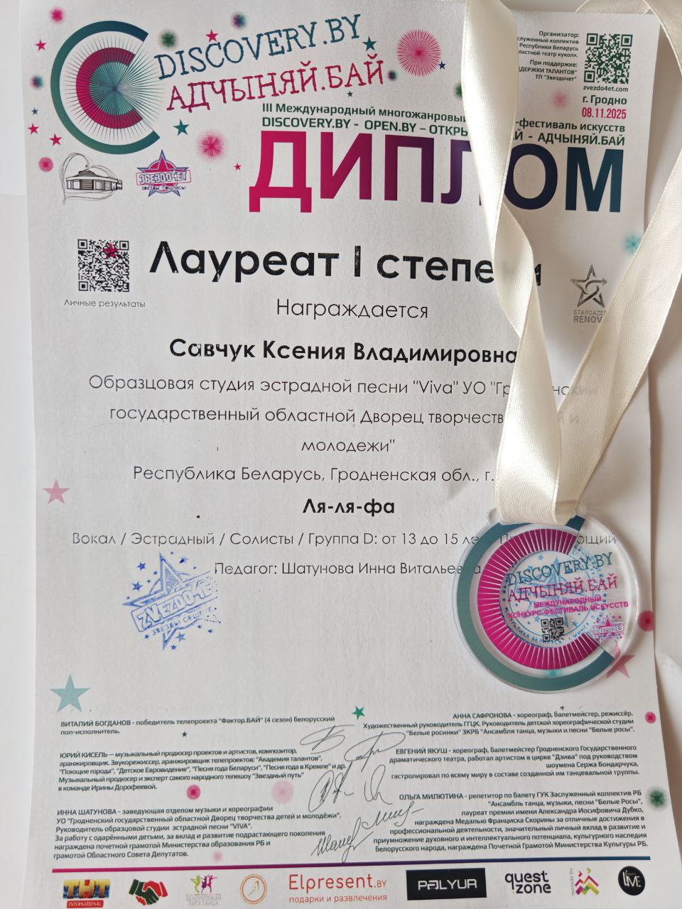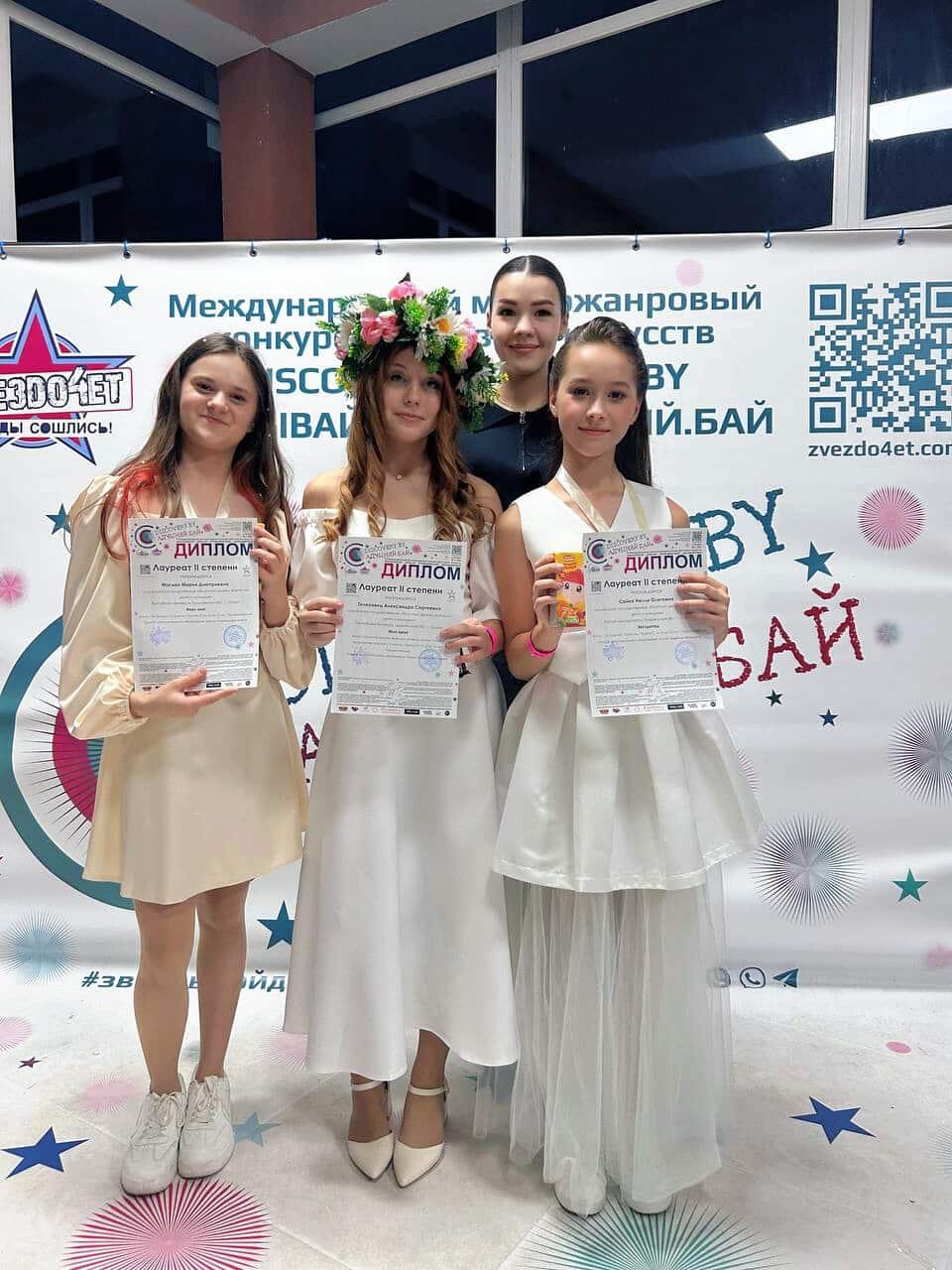Дипломом лауреата I степени награждены Александра Уронич и Ксения Савчук, солисты образцовой студии эстрадной песни "Viva" , педагог Шатунова И.В.