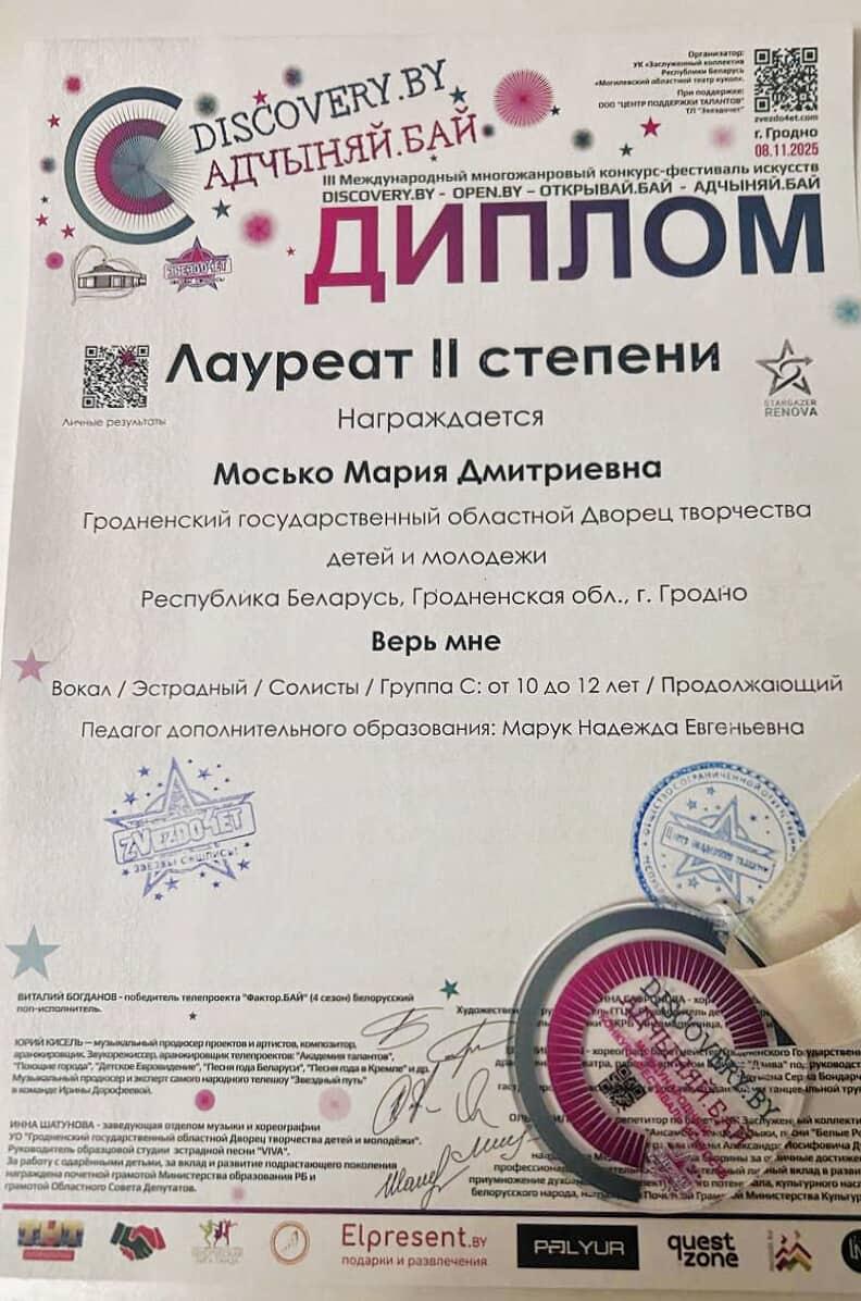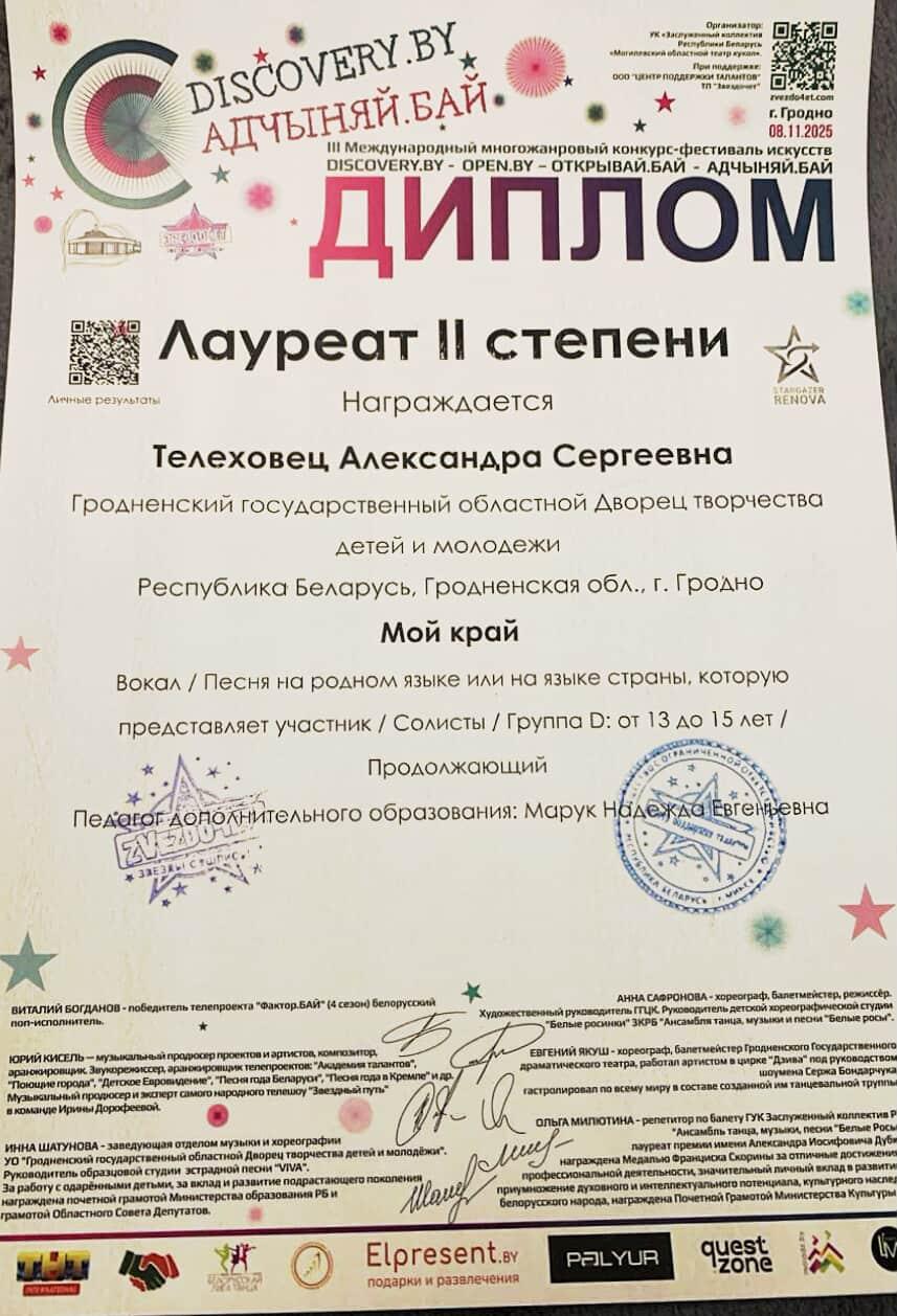 Дипломом лауреата II степени награждены Александра Телеховец, Мария Мосько, Сайко Нелли, участницы кружка "Эстрадный вокал", педагог Марук Н.Е.