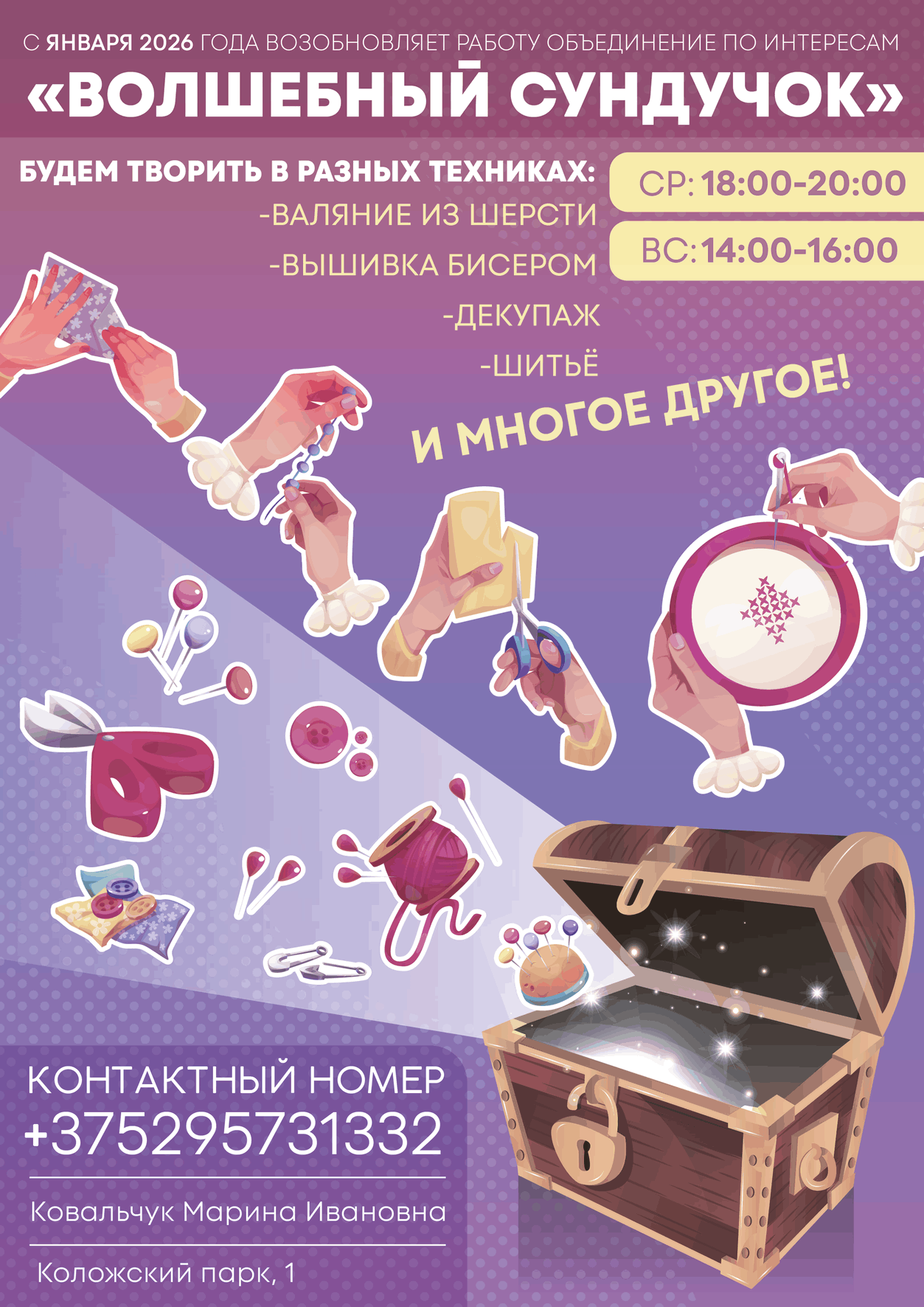- На занятиях объединения дети обучаются разнообразным техникам рукоделия. Здесь можно научиться делать игрушки, подарки, открытки, украшения в технике валяния, скрапбукинга, вязания крючком, изготовление текстильной куклы и тд. Дети развивают навыки и творческое мышление, находят для себя увлекательное и любимое хобби, интересно, весело и с пользой проводят своё свободное время.